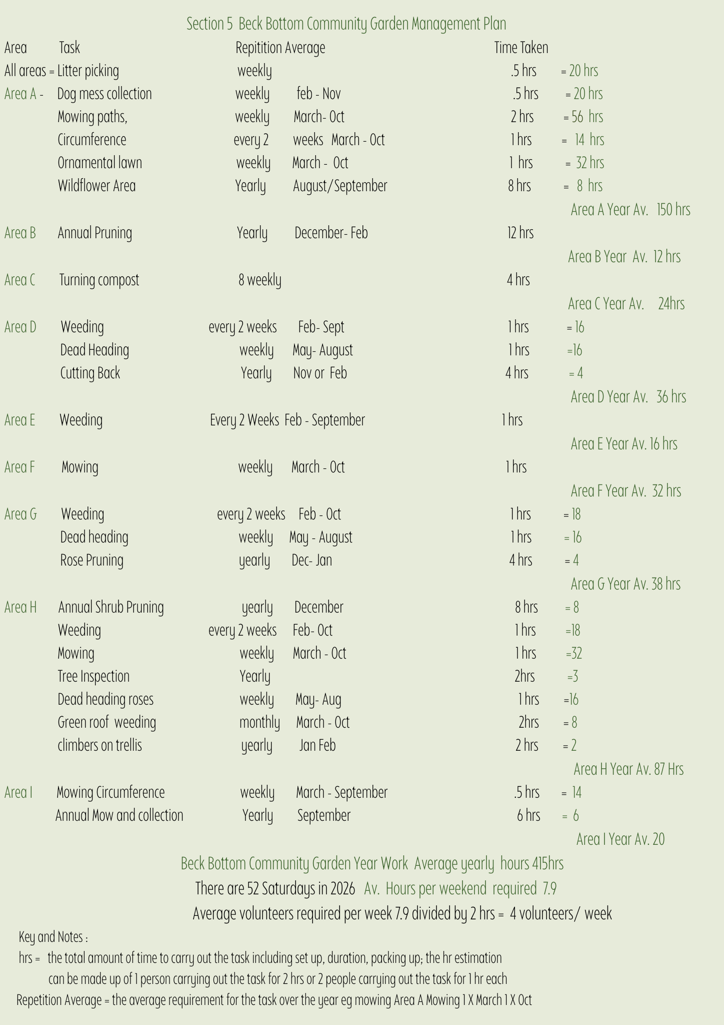 The table below is intended to provide guidance for the amount of volunteers required to manage the identified repetitive tasks at the Beck Bottom Garden.